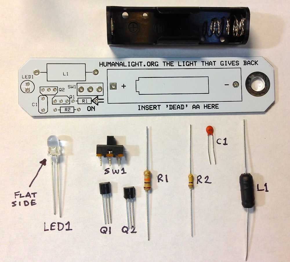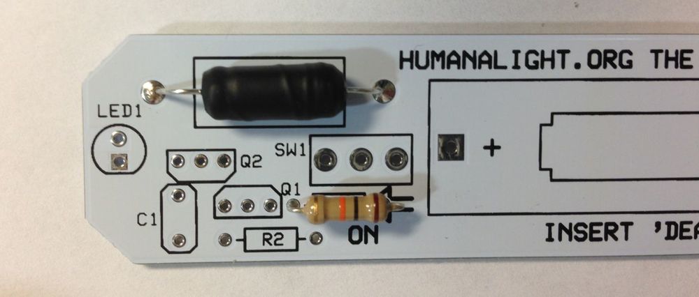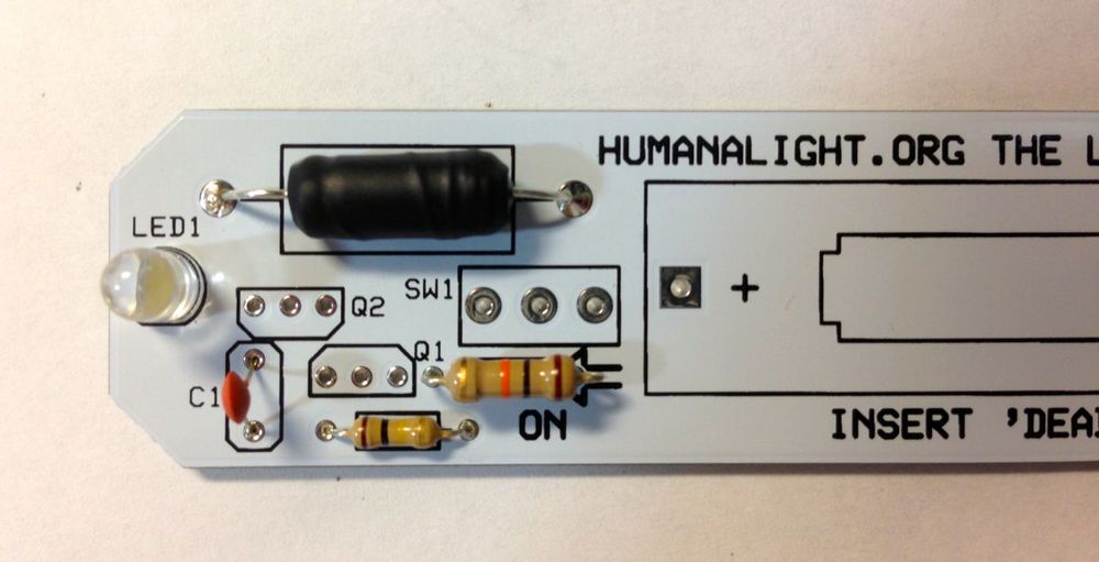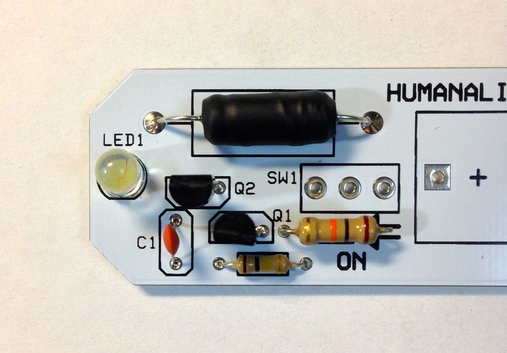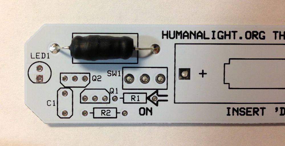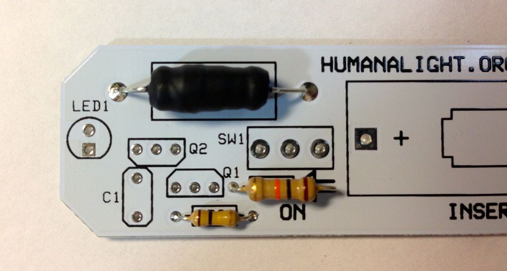 Note: The orientation of the LED, transistors, and battery holder are printed on the HumanaLight circuit board. See detailed photos below: