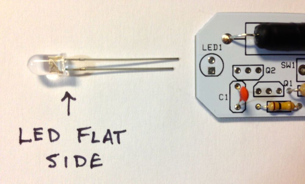 - Note that the LED can be soldered flat-mounted directly to the circuit board, or the leads can be bent at a right angle (better for forward-facing flashlight use). See example in image at the top of this page